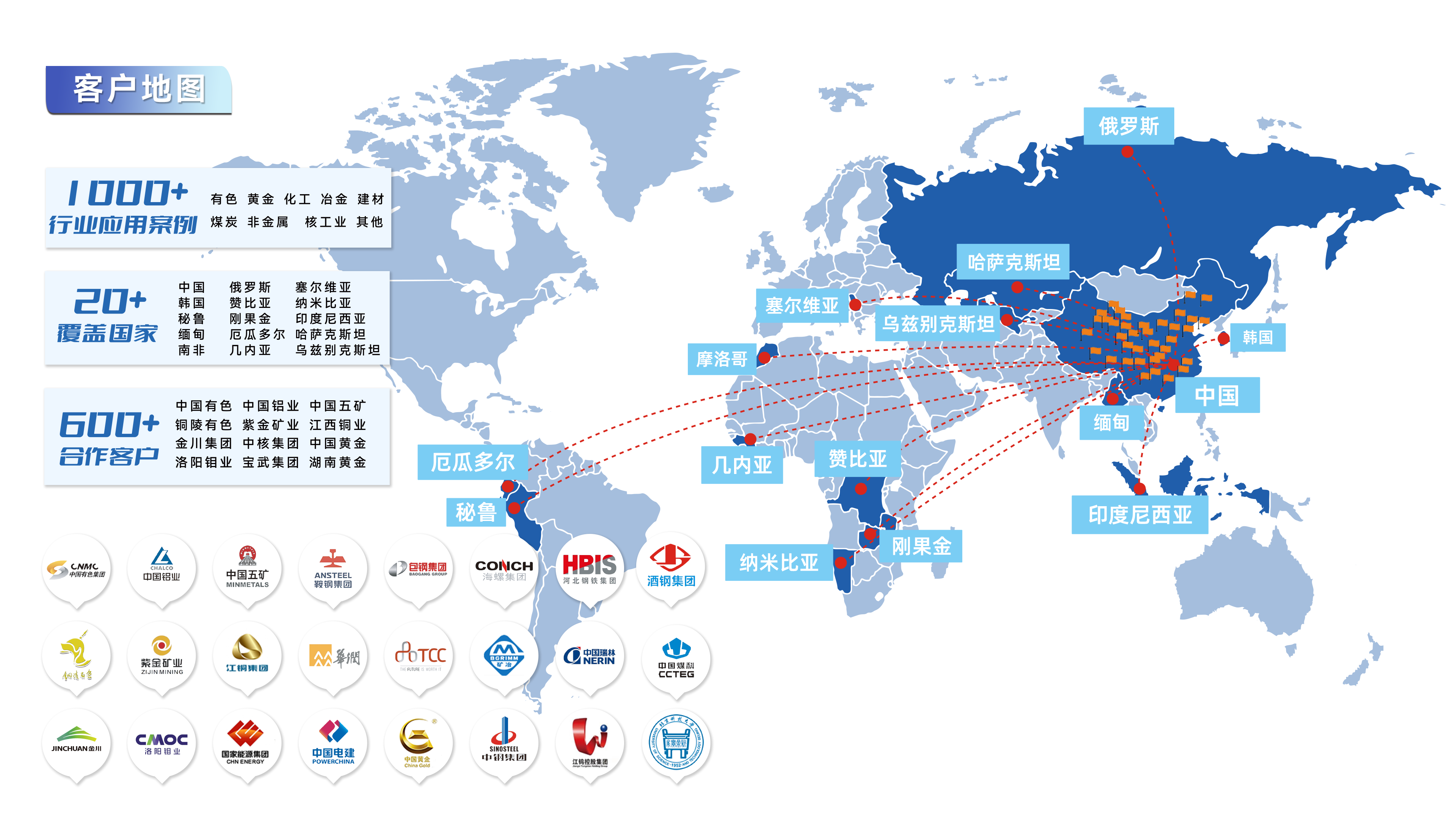 目前,欧博ABG科技产品与服务覆盖全球20多个国家和地区,包括中国、韩国、印度尼西亚、哈萨克斯坦、赞比亚、纳米比亚、刚果金、南非、俄罗斯、塞尔维亚、秘鲁等矿产资源丰富的国家,逐步形成覆盖亚、非、欧、美四大洲的市场网络。